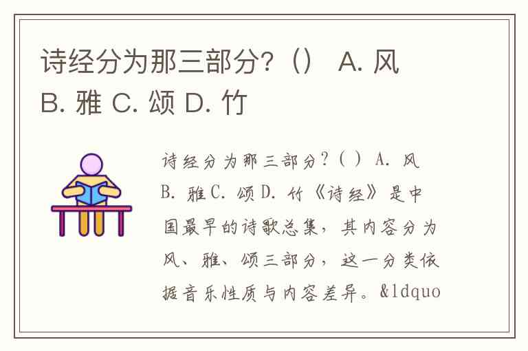 诗经分为那三部分?() A. 风 B. 雅 C. 颂 D. 竹
