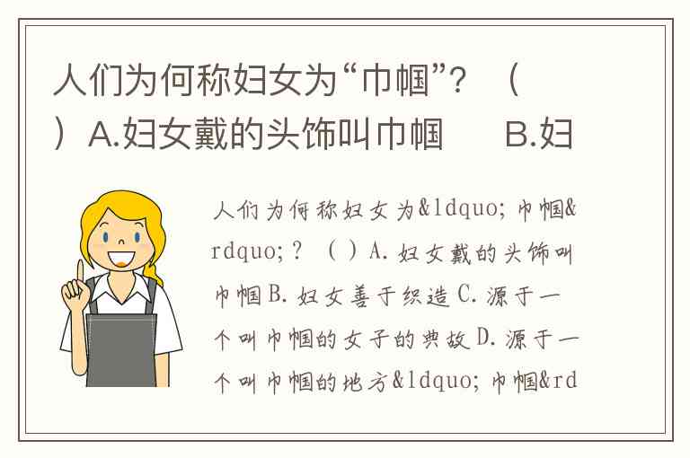 人们为何称妇女为“巾帼”?()A.妇女戴的头饰叫巾帼 B.妇女善于织造 C.源于一个叫巾帼的女子的典故 D.源于一个叫巾帼的地方