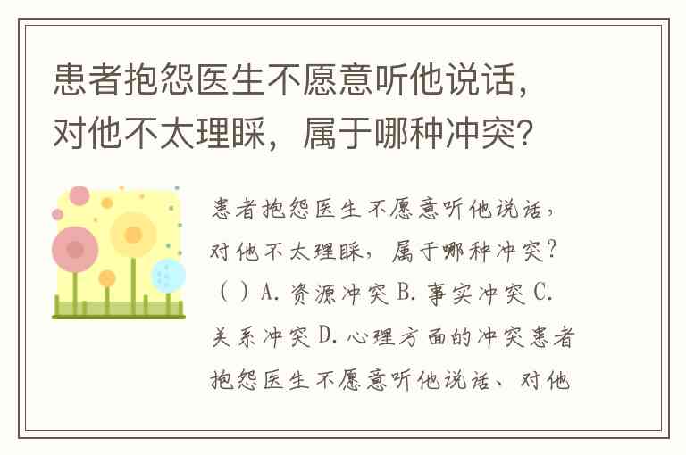 患者抱怨医生不愿意听他说话、对他不太理睬,这种情况属于关系冲突(选项C)。这一判断在多项医师考核题库中均有明确答案支持,其核心特征是医患双方在沟通互动、情感态度层面出现分歧,而非针对医疗事实或资源分配的争议。