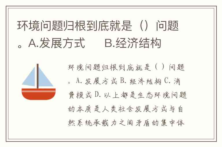 环境问题归根到底就是()问题。A.发展方式 B.经济结构 C.消费模式 D.以上都是