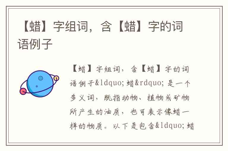 “蜡”是一个多义词,既指动物、植物或矿物所产生的油质,也可表示像蜡一样的物质。以下是包含“蜡”字的常用词语及分类示例,涵盖自然现象、日常用品、文化艺术等多个领域: