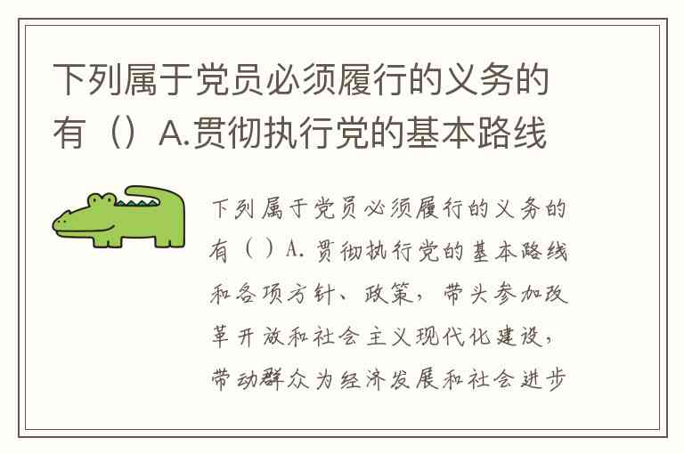 下列属于党员必须履行的义务的有()A.贯彻执行党的基本路线和各项方针、政策,带头参加改革开放和社会主义现代化建设,带动群众为经济发展和社会进步艰苦奋斗,在生产、工作、学习和社会生活中起先锋模范作用 B.坚持党和人民的利益高于一切,个人利益服从党和人民的利益,吃苦在前,享受在后,克己奉公,多做贡献 C.自觉遵守党的纪律,模范遵守国家的法律法规,严格保守党和国家的秘密,执行党的决定,服从组织分配,积极完成党的任务 D.维护党的团结和统一,对党忠诚老实,言行一致,坚决反对一切派别组织和小集团活动,反对阳奉阴违的两面派行为和一切阴谋诡计 E.切实开展批评和自我批评,勇于揭露和纠正工作中的缺点、错误,坚决同消极腐败现象作斗争