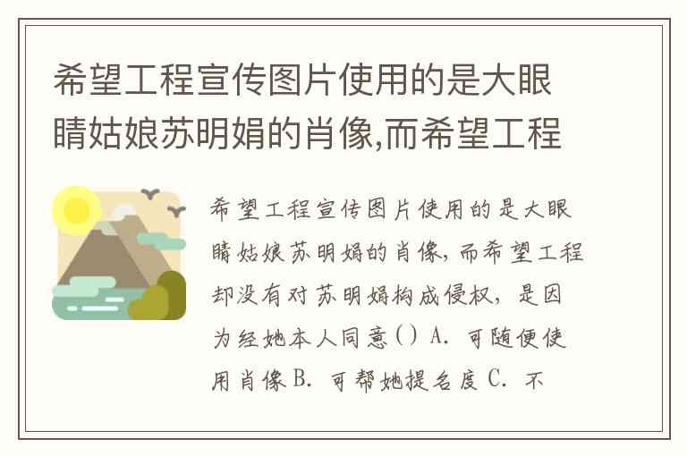 希望工程宣传图片使用的是大眼睛姑娘苏明娟的肖像,而希望工程却没有对苏明娟构成侵权, 是因为经她本人同意( ) A. 可随便使用肖像 B. 可帮她提名度 C. 不以营利为目的 D. 可得到他人的同情