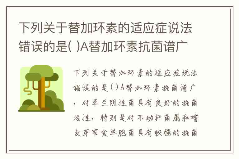 下列关于替加环素的适应症说法错误的是( )A替加环素抗菌谱广,对革兰阴性菌具有良好的抗菌活性,特别是对不动杆菌属和嗜麦芽窄食单胞菌具有较强的抗菌作用 B对变形杆菌属、铜绿假单胞菌等敏感 C对多数革兰氏阳性耐药菌如MRSA、PRSP、VRE等都具有良好的抗菌活性 D替加环素对非典型致病原和厌氧菌有一定抗菌活性