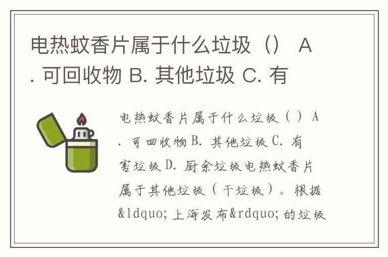 电热蚊香片属于什么垃圾() A. 可回收物 B. 其他垃圾 C. 有害垃圾 D. 厨余垃圾
