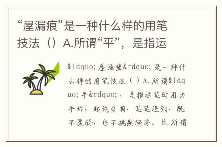 “屋漏痕”是一种什么样的用笔技法()A.所谓“平”,是指运笔时用力平均,起讫分明,笔笔送到,既不柔弱,也不挑剔轻浮。 B.所谓“圆”,是指行笔转折处要圆而有力,不妄生圭角。 C.所谓“留”,是指运笔要含蓄,要有回顾,不急不徐,不浮不滑,不放诞犷野。 D所谓“重”即沉着而有重量,要如“高山坠石”,不能象“风吹落叶”,即古人说的“笔力能扛鼎”的意思。