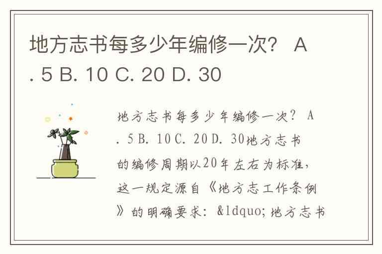 地方志书每多少年编修一次? A. 5 B. 10 C. 20 D. 30