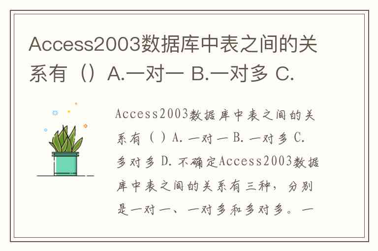 Access2003数据库中表之间的关系有()A.一对一 B.一对多 C.多对多 D.不确定