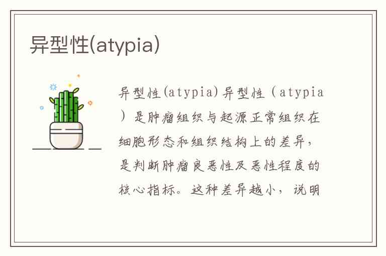 异型性(atypia)是肿瘤组织与起源正常组织在细胞形态和组织结构上的差异,是判断肿瘤良恶性及恶性程度的核心指标。这种差异越小,说明肿瘤细胞与正常细胞越相似(分化程度高);差异越大,则意味着细胞成熟障碍越严重(分化程度低),通常提示更高的恶性风险。