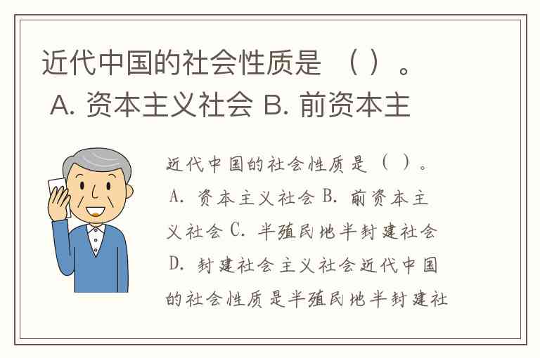 近代中国的社会性质是 ( )。 A. 资本主义社会 B. 前资本主义社会 C. 半殖民地半封建社会 D. 封建社会主义社会