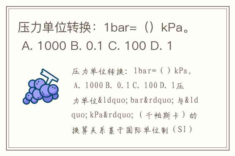 压力单位转换:1bar=()kPa。 A. 1000 B. 0.1 C. 100 D. 1