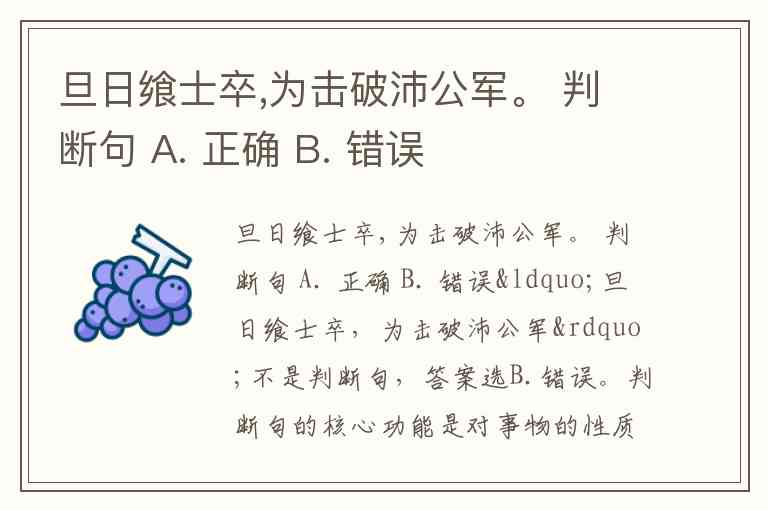 判断句的核心功能是对事物的性质、类别或关系作出判断(如“……者,……也”“……为……”等结构),其谓语通常由名词、名词性短语或判断词(如“是”“为”作判断动词时)充当。而此句中,“为”并非判断动词,而是介词,表目的,可译为“为了”;“击破沛公军”是动词性短语,作“为”的宾语,构成“为(介词)+ 动词短语”的目的状语结构。全句意为“明天犒劳士兵,为了打败沛公的军队”,表达的是行动目的,而非判断,因此不符合判断句的语法特征。