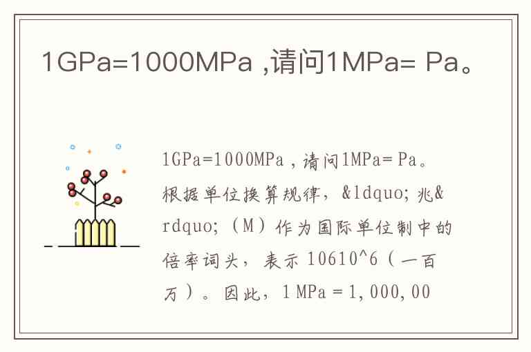 根据单位换算规律,“兆”(M)作为国际单位制中的倍率词头,表示 (一百万)。因此,1 MPa = 1,000,000 Pa,即 帕斯卡。这一换算关系与“吉帕”(GPa)和“兆帕”(MPa)的关系一致:1 GPa = 1000 MPa,每个相邻单位间相差 倍,而从 MPa 到 Pa 则跨越了 量级。工程领域中,MPa 常用于描述材料强度(如钢材屈服强度约200-300 MPa),而 Pa 更适用于微小压力场景(如标准大气压约 Pa)。记住“兆”代表百万,就能快速完成 MPa 与 Pa 间的换算。
