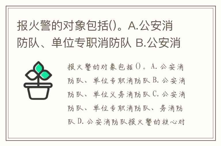 报火警的对象包括()。A.公安消防队、单位专职消防队 B.公安消防队、单位义务消防队 C.公安消防队、单位专职消防队、务消防队 D.公安消防队