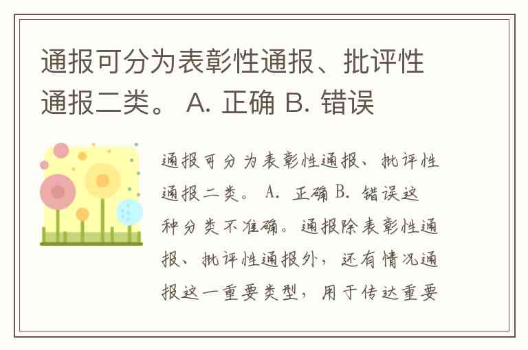 通报可分为表彰性通报、批评性通报二类。 A. 正确 B. 错误
