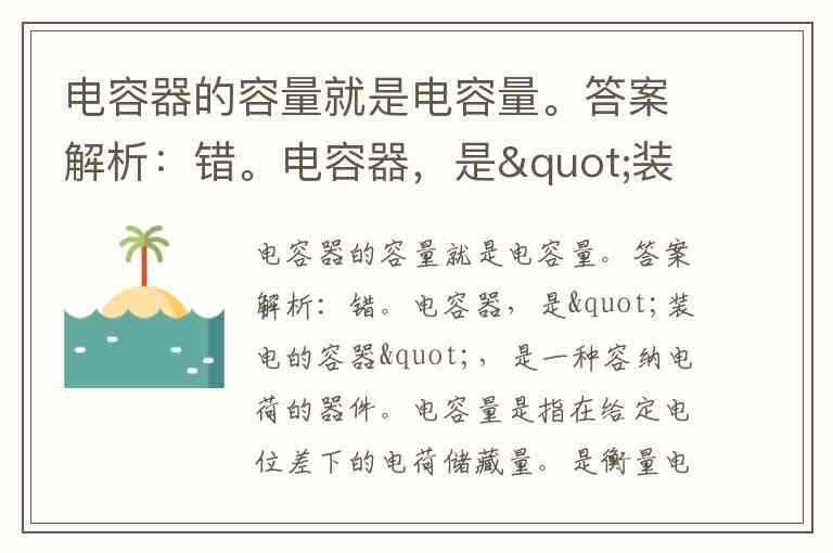 电容器的容量就是电容量。答案解析:错。电容器,是"装电的容器",是一种容纳电荷的器件。电容量是指在给定电位差下的电荷储藏量。是衡量电容器贮存电量的指标示值。 A. 正确 B. 错误