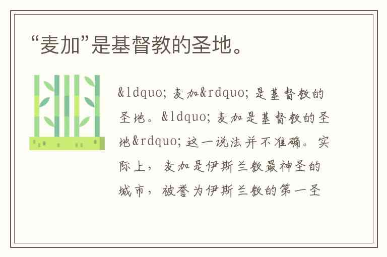 “麦加是基督教的圣地”这一说法并不准确。实际上,麦加是伊斯兰教最神圣的城市,被誉为伊斯兰教的第一圣地。这里是伊斯兰教创始人穆罕默德的诞生地,也是他创立和传播伊斯兰教的地方。公元630年,穆罕默德率兵攻占麦加后,将城中的圣殿改为伊斯兰教清真寺,并宣布麦加是伊斯兰教最神圣的地方,使其成为穆斯林朝觐的中心,这是伊斯兰教五功之一。麦加拥有克尔白(伊斯兰教第一大圣寺——禁寺即坐落于此),世界各地的穆斯林每天的礼拜活动,都是头朝着麦加圣地进行的。