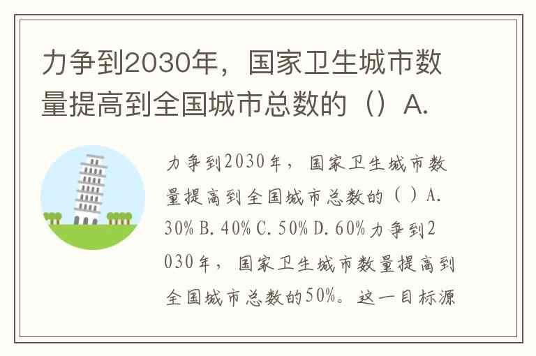 力争到2030年,国家卫生城市数量提高到全国城市总数的()A.30% B.40% C.50% D.60%