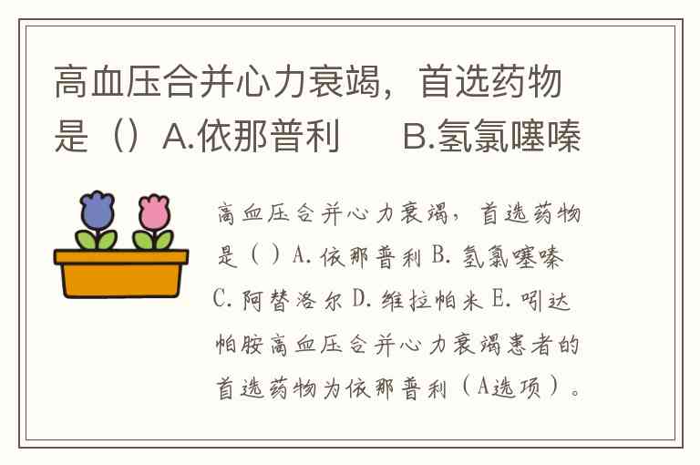高血压合并心力衰竭,首选药物是()A.依那普利 B.氢氯噻嗪 C.阿替洛尔 D.维拉帕米 E.吲达帕胺
