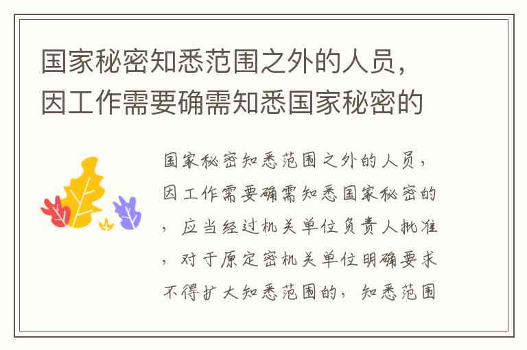 国家秘密知悉范围之外的人员,因工作需要确需知悉国家秘密的,应当经过机关单位负责人批准,对于原定密机关单位明确要求不得扩大知悉范围的,知悉范围需要扩大时,应当经过机关单位负责人批准。
