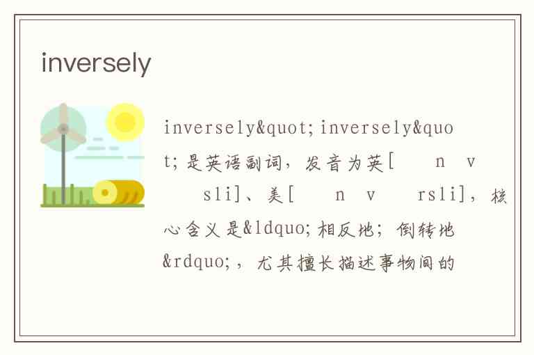 "inversely"是英语副词,发音为英[ˌɪnˈvɜːsli]、美[ˌɪnˈvɜːrsli],核心含义是“相反地;倒转地”,尤其擅长描述事物间的反向关联。它像一把精密的语言工具,在不同领域搭建起变量之间的动态关系桥梁。