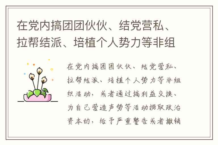 在党内搞团团伙伙、结党营私、拉帮结派、培植个人势力等非组织活动,或者通过搞利益交换、为自己营造声势等活动捞取政治资本的,给予严重警告或者撤销党内职务处分;导致本地区、本部门、本单位政治生态恶化的,给予留党察看或者开除党籍处分。()A.国务院 B.卫生部门 C.中央宣传部 D.各省政府