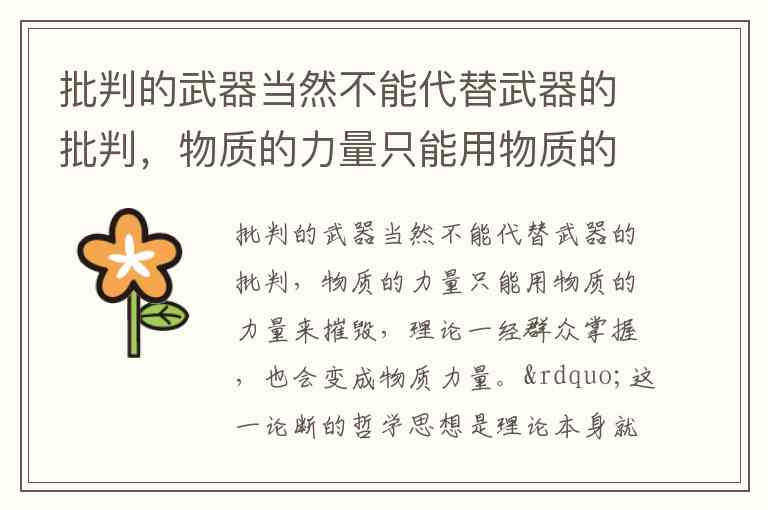 批判的武器当然不能代替武器的批判,物质的力量只能用物质的力量来摧毁,理论一经群众掌握,也会变成物质力量。”这一论断的哲学思想是理论本身就是物质的力量。() A. 正确 B. 错误