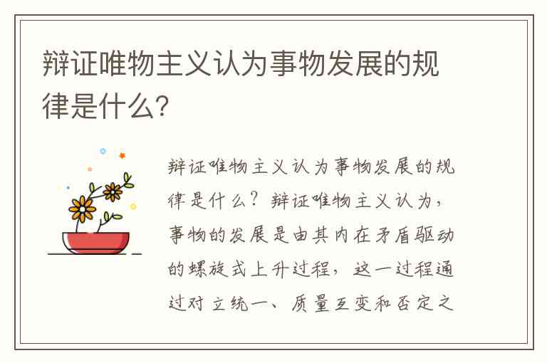 辩证唯物主义认为,事物的发展是由其内在矛盾驱动的螺旋式上升过程,这一过程通过对立统一、质量互变和否定之否定三大规律展开,共同构成了自然界、人类社会和思维发展的普遍法则。