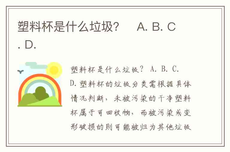 塑料杯的垃圾分类需根据具体情况判断,未被污染的干净塑料杯属于可回收物,而被污染或变形破损的则可能被归为其他垃圾(干垃圾)。中国垃圾分类通常分为可回收物、有害垃圾、厨余垃圾和其他垃圾四类,塑料杯因材质特性(如聚乙烯PE、聚丙烯PP),在干净状态下符合可回收物“适宜循环利用”的定义。例如,昆明市明确将塑料杯列为可回收物中的塑料制品类别。