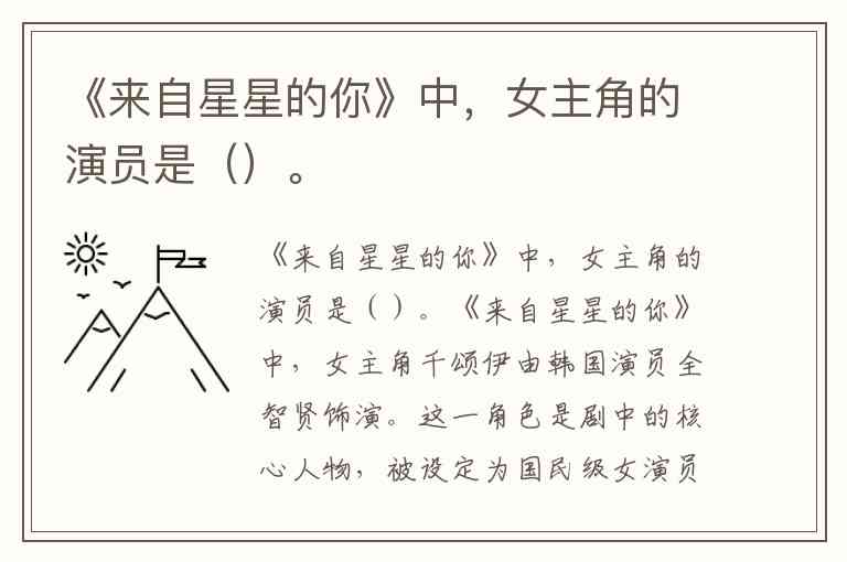 《来自星星的你》中,女主角千颂伊由韩国演员全智贤饰演。这一角色是剧中的核心人物,被设定为国民级女演员,兼具美貌与率真性格,其形象通过全智贤的演绎成为韩流文化中的经典符号。