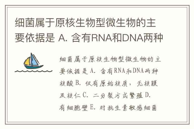 细菌属于原核生物型微生物的主要依据是 A. 含有RNA和DNA两种核酸 B. 仅有原始核质,无核膜及核仁 C. 二分裂方式繁殖 D. 有细胞壁 E. 对抗生素敏感