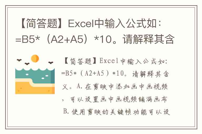 【简答题】Excel中输入公式如:=B5*(A2+A5)*10。请解释其含义。A.在剪映中添加画中画视频,可以设置画中画视频铺满画布 B.使用剪映的关键帧功能可以设置蒙版动画 C.使用剪映的色度抠图功能只能抠出画面中的绿色部分 D.剪映预设了11款不同的混合模式,可以帮助用户更好地制作特效视频