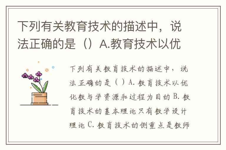 下列有关教育技术的描述中,说法正确的是()A.教育技术以优化教与学资源和过程为目的 B.教育技术的基本理论只有教学设计理论 C.教育技术的侧重点是教师的教 D.教育技术的研究对象是“教学资源”