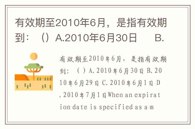 有效期至2010年6月,是指有效期到:()A.2010年6月30日 B.2010年6月29日 C.2010年6月1日 D.2010年7月1日