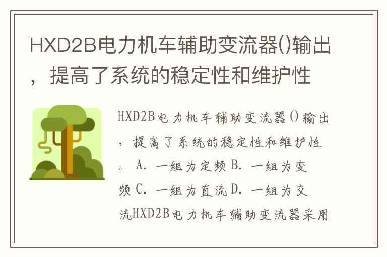 HXD2B电力机车辅助变流器()输出,提高了系统的稳定性和维护性。 A. 一组为定频 B. 一组为变频 C. 一组为直流 D. 一组为交流