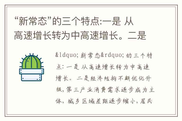 “新常态”的三个特点表述正确。2014年11月,习近平总书记在亚太经合组织(APEC)工商领导人峰会上首次系统阐述中国经济“新常态”,明确指出其主要特点包括:经济增长从高速转向中高速,经济结构不断优化升级(第三产业、消费需求逐步成为主体,城乡区域差距逐步缩小,居民收入占比上升,发展成果惠及更广大民众),以及从要素驱动、投资驱动转向创新驱动。这些特征准确概括了中国经济发展阶段的转变。