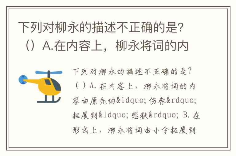 下列对柳永的描述不正确的是?()A.在内容上,柳永将词的内容由原先的“伤春”拓展到“悲秋” B.在形式上,柳永将词由小令拓展到长调。 C.柳永的《定风波》中“终日恹恹倦梳裹”意同温庭筠《菩萨蛮》“懒起画蛾眉”,但是不能像温词一样给人以离骚初服的联想。 D.柳永对词所做的贡献主要是对其音乐性上所作的发展,“中吕调”曲也是柳永所创作的