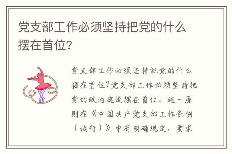 党支部工作必须坚持把党的政治建设摆在首位。这一原则在《中国共产党支部工作条例(试行)》中有明确规定,要求党支部牢固树立“四个意识”,坚定“四个自信”,做到“四个服从”,旗帜鲜明讲政治,坚决维护习近平总书记党中央的核心、全党的核心地位,坚决维护党中央权威和集中统一领导。