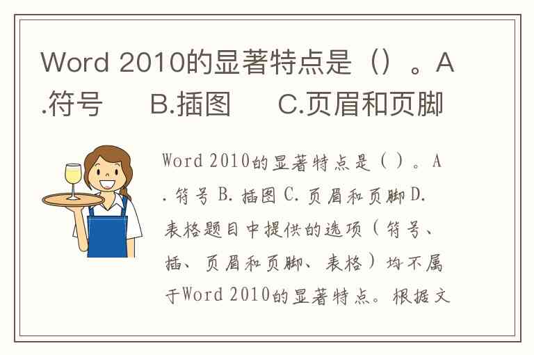 题目中提供的选项(符号、插、页眉和页脚、表格)均不属于Word 2010的显著特点。根据文档资料,Word 2010的核心创新在于SmartArt图形转换、跨设备文档访问和改进的搜索导航等功能。
