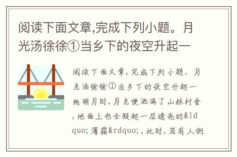 阅读下面文章,完成下列小题。月光汤徐徐①当乡下的夜空升起一轮明月时,月光便洒满了山林村舍,地面上也会凝起一层透亮的“薄霜”,此时,若有人侧耳去听,定可听得到孩童们的踏“霜”之声——三五成群的他们,在晒谷场上追逐打闹,做各种有趣的游戏,捕草屋下的鸟雀……玩得不亦乐乎。②孩子喜欢有月光的夜晚,大人们也是。一天晚上,月光很亮,亮得连父亲也觉得待在屋内睡觉未免太过可惜。于是,他便带我去村外的湖边夜钓。③月光如水,湖平如镜,豌豆般大小的浮漂飘在水面上粒粒可见。先是点点浮颤,继而微微下沉,当浮漂猛地一沉,父亲便迅速起竿,一条白花花的鱼便在水中扑腾翻转了起来,上钩了!④用光清澈、白亮,想是鱼儿也不忍就此睡去,纷纷就着一盏月光灯,在湖中来回穿行。当鱼饵明晃晃地摇曳在水里,它们又怎会怀疑这份恬静背后的真相呢?就这样,父亲的鱼篓,很快便满了。⑤我们有些饿了,父亲为我们煮一罐鱼汤。很快,鱼汤泛起了奶白色,像一捧捣碎的月光,皎洁地盛在罐子里。父亲让我先喝,喝剩下的再给他,好东西他总是让我先尝。⑥父亲在一旁说道:“这可不是一般的鱼汤,而是一罐月光汤,喝下这碗汤,心里就会安宁无比,少怨,无烦。”记忆中,这是父亲说过的最富诗意的话,让我终身难忘。⑦那一刻,眼前皮肤黝黑,整日忙碌的农民父亲,俨然像个白面书生,中年文艺男,只是他把精力全给了日复一日的田间劳作。⑧是的,为了家人,父亲不得不埋身田间地头。每遇旱季,我们都要用好几台水车,将山下的泉水往高处的梯田里翻送。白天轮不到我们翻,只有等晚上,月光下,父亲、我和妹妹,一人负责拉动一台水车一阶一阶地朝上翻送泉水。⑨父亲的水车放得最陡,梯度也最大,拉起来格外费劲,他把平缓的梯度留给了我和妹妹。即便如此,他也总是快速地拉几十下自己的水车,随后便过来帮我和妹妹。一年年白花花的月光泉便是这样,从低处翻淌进我们的梯田里。常常一忙就是一整夜,累了,父亲便以堤埂为床,躺在月光里,小睡一会儿。有时,我会抱怨,觉得这活太累,收益小,可父亲却说,百滴水就能教活一棵稻,只要水到了,就不会颗粒无收。莫要怨了,月亮不都在陪着我们,给我们照明嘛!⑩暑假里,父亲常去集市卖红著。凌晨2点便要担货出发,夜行山路,我打手电筒照路给他壮胆。倘有月光明道,父亲便会独自上路,不要我陪。月光,便是他的伴,他的明灯,他的保护神。⑪父亲读过书,写一手好文章,本可以到城里谋个好差事,可他坚持留在乡下。我从未见过他因乡下的清苦而抱怨,他常对我说:“乡下很好呀,晚上还有很白净的月光,有什么可抱怨的呢?你在城里,要是累了,烦了,就回来看看乡下的月光吧!”⑫一罐月光汤,一车月光泉,一弯月光路,我终于读懂了父亲因为心中始终有月光,他才能在岁月的千沟万壑中,且从不发一声怨言。在父亲看来,若是觉得人生苦,根源是心里有苦,不管遇到何种困难和不顺只要心田能常被月光滋润,不干涸,不开裂,人生便有希望和奔头,心也就不苦了。(《思维与智慧》)2019年第5期 有改动)(1)下列对文章的理解分析不正确的一项是( ) A. 第⑦段是过渡段,“那一刻”“白面书生”等承接上文,“田间劳作”开启下文的叙写。 B. 第⑩段画线句子运用了排比的修辞手法,强调了月光对父亲人生的重大影响。 C. 文章最后一段运用议论、抒情的表达方式,直接抒怀,增强文章的深刻性和感染力。 D. 作者回忆了与父亲相处的几个生活场景,表达了对父亲的惋惜、感激、赞美之情。