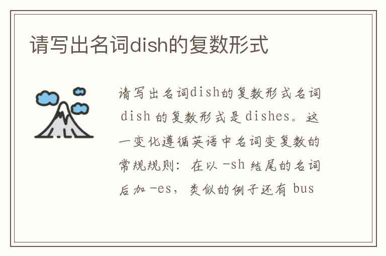 名词 dish 的复数形式是 dishes。这一变化遵循英语中名词变复数的常规规则:在以 -sh 结尾的名词后加 -es,类似的例子还有 bus→buses、box→boxes。无论是表示“菜肴”(如 traditional Chinese dishes)还是“餐具”(如 wash the dishes),其复数形式均为 dishes。掌握这类规则能帮助我们更准确地表达数量概念,比如在描述一顿饭包含多道菜品时,直接使用 dishes 即可清晰传达含义。
