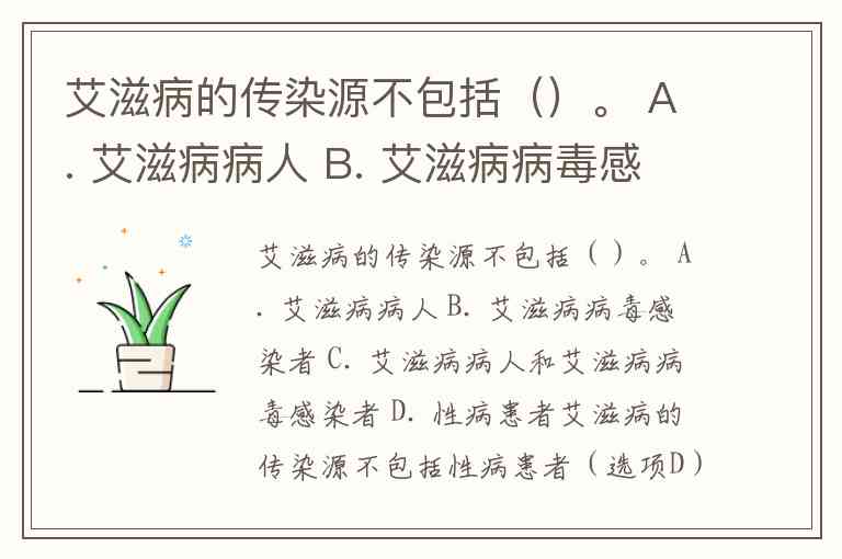 艾滋病的传染源不包括()。 A. 艾滋病病人 B. 艾滋病病毒感染者 C. 艾滋病病人和艾滋病病毒感染者 D. 性病患者