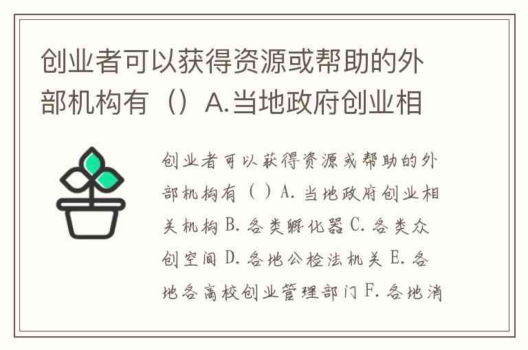 创业者可以获得资源或帮助的外部机构有()A.当地政府创业相关机构 B.各类孵化器 C.各类众创空间 D.各地公检法机关 E.各地各高校创业管理部门 F.各地消费者热线