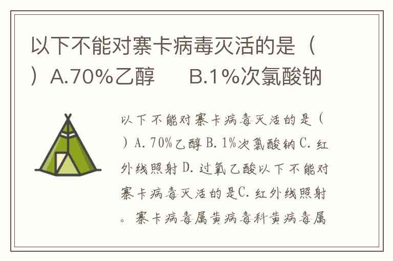 以下不能对寨卡病毒灭活的是C.红外线照射。寨卡病毒属黄病毒科黄病毒属,虽具体抵抗力数据有限,但该属病毒普遍对物理和化学因素敏感。根据防控方案及诊疗指南,70%乙醇、1%次氯酸钠、过氧乙酸等化学消毒剂,以及紫外线照射均可有效灭活病毒。例如,60℃加热30分钟或使用脂溶剂处理也能达到灭活效果。