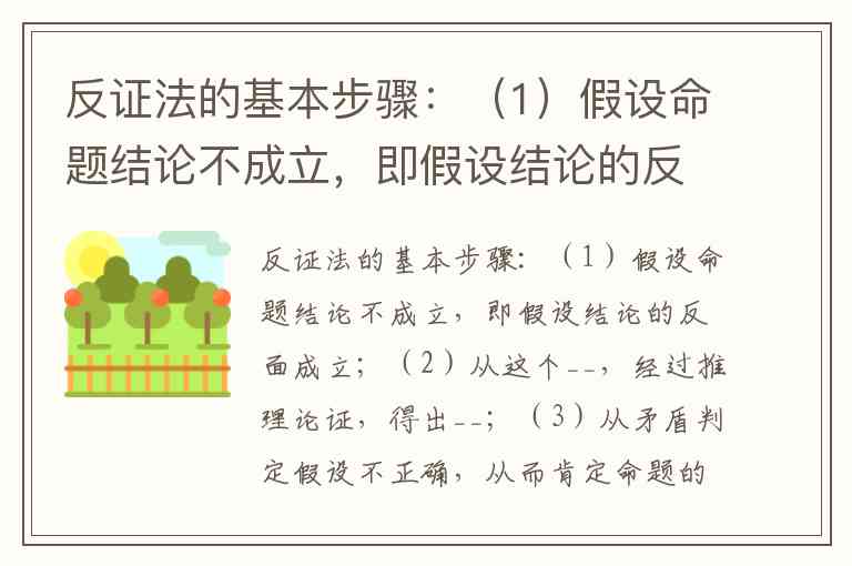 反证法的基本步骤:(1)假设命题结论不成立,即假设结论的反面成立;(2)从这个反设出发,经过推理论证,得出矛盾;(3)从矛盾判定假设不正确,从而肯定命题的结论正确。