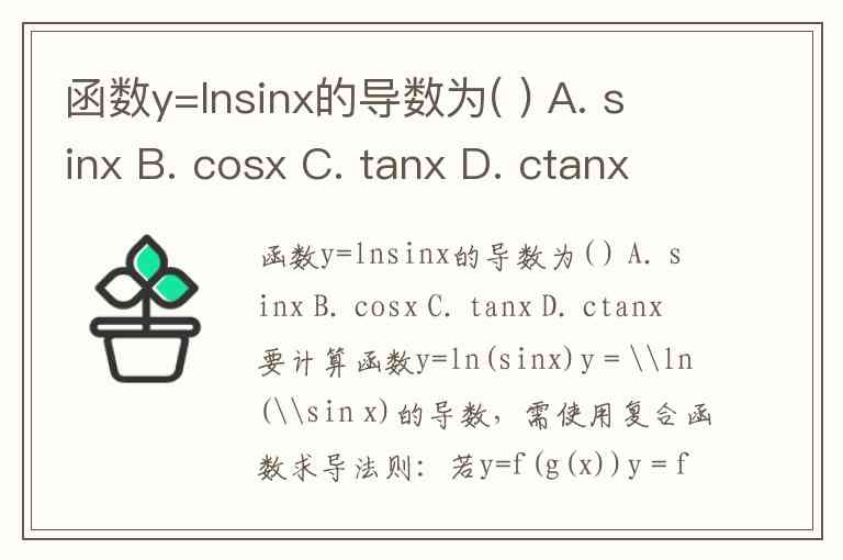 函数y=lnsinx的导数为( ) A. sinx B. cosx C. tanx D. ctanx