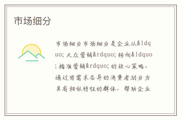 市场细分是企业从“大众营销”转向“精准营销”的核心策略,通过将需求各异的消费者划分为具有相似特征的群体,帮助企业聚焦资源、提升竞争力。这一概念由美国学者温德尔·史密斯于1956年提出,如今已成为现代营销的基石,正如管理学大师彼得·德鲁克所言:“企业的唯一目的是创造顾客”,而市场细分正是找到这些顾客的科学方法。