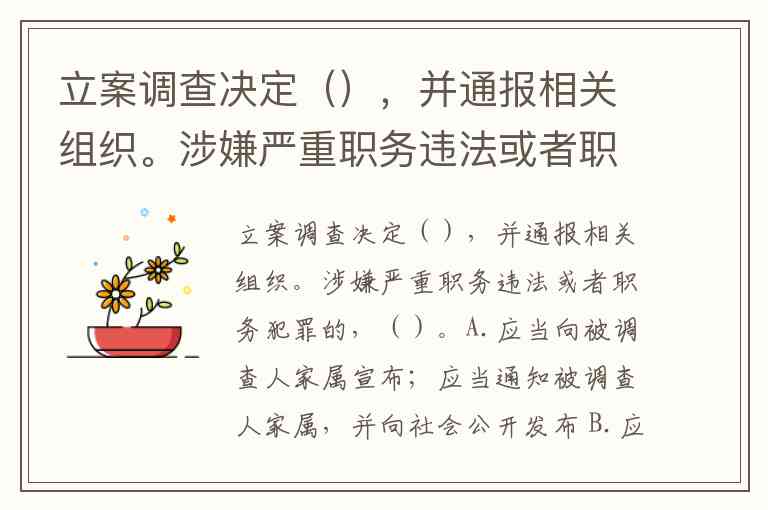 立案调查决定(),并通报相关组织。涉嫌严重职务违法或者职务犯罪的,()。A.应当向被调查人家属宣布;应当通知被调查人家属,并向社会公开发布 B.应当向被调查人宣布;应当通知被调查人家属 C.应当向被调查人宣布;应当通知被调查人家属,并向社会公开发布 D.应当向被调查人宣布;应当通知被调查人家属,酌情向社会公开发布