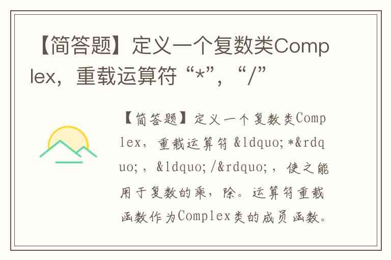 【简答题】定义一个复数类Complex,重载运算符 “*”,“/”,使之能用于复数的乘,除。运算符重载函数作为Complex类的成员函数。编程序,分别求出两个复数之积和商。初值自拟。提示:两复数相乘的计算公式为:(a+bi)*(c+di)=(ac-bd)+(ad+bc)i。两复数相除的计算公式为:(a+bi)/(c+di)=(ac+bd)/(c*c+d*d)+(bc-ad) /(c*c+d*d)i。