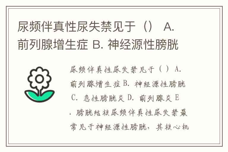 尿频伴真性尿失禁见于() A. 前列腺增生症 B. 神经源性膀胱 C. 急性膀胱炎 D. 前列腺炎 E. 膀胱结核